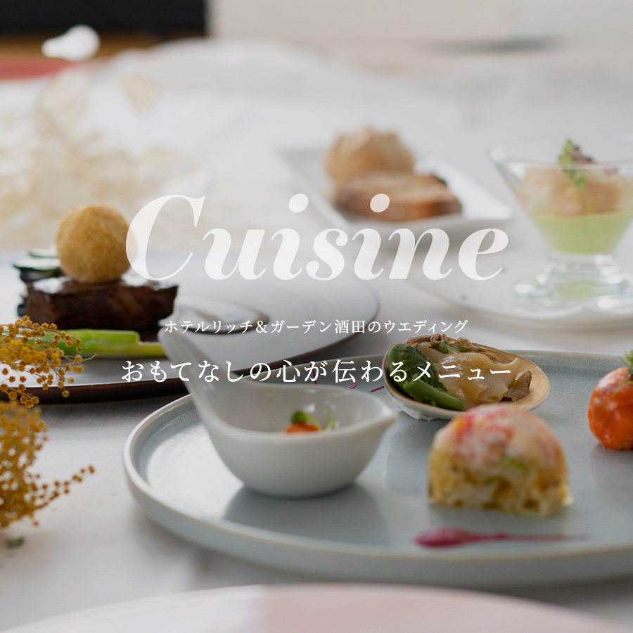 庄内の季節ごとの旬の食材を取り入れ、一皿ごと想いを込めたメニューでおもてなし。料理の温度にこだわりパーティー会場の隣に併設されたキッチンから“温かいものは温かく、冷たいものは冷たく” 作りたてをお届けいたします。